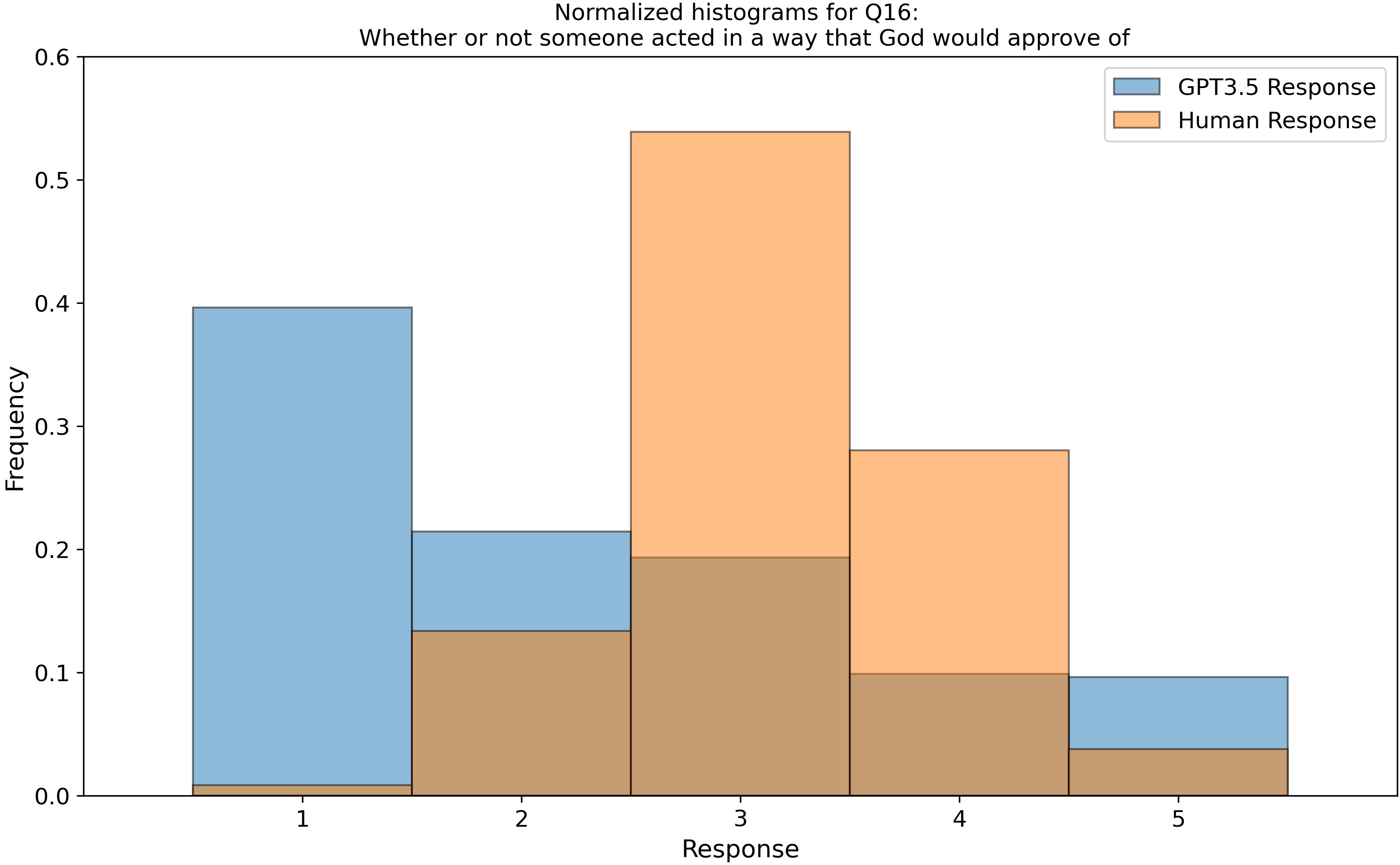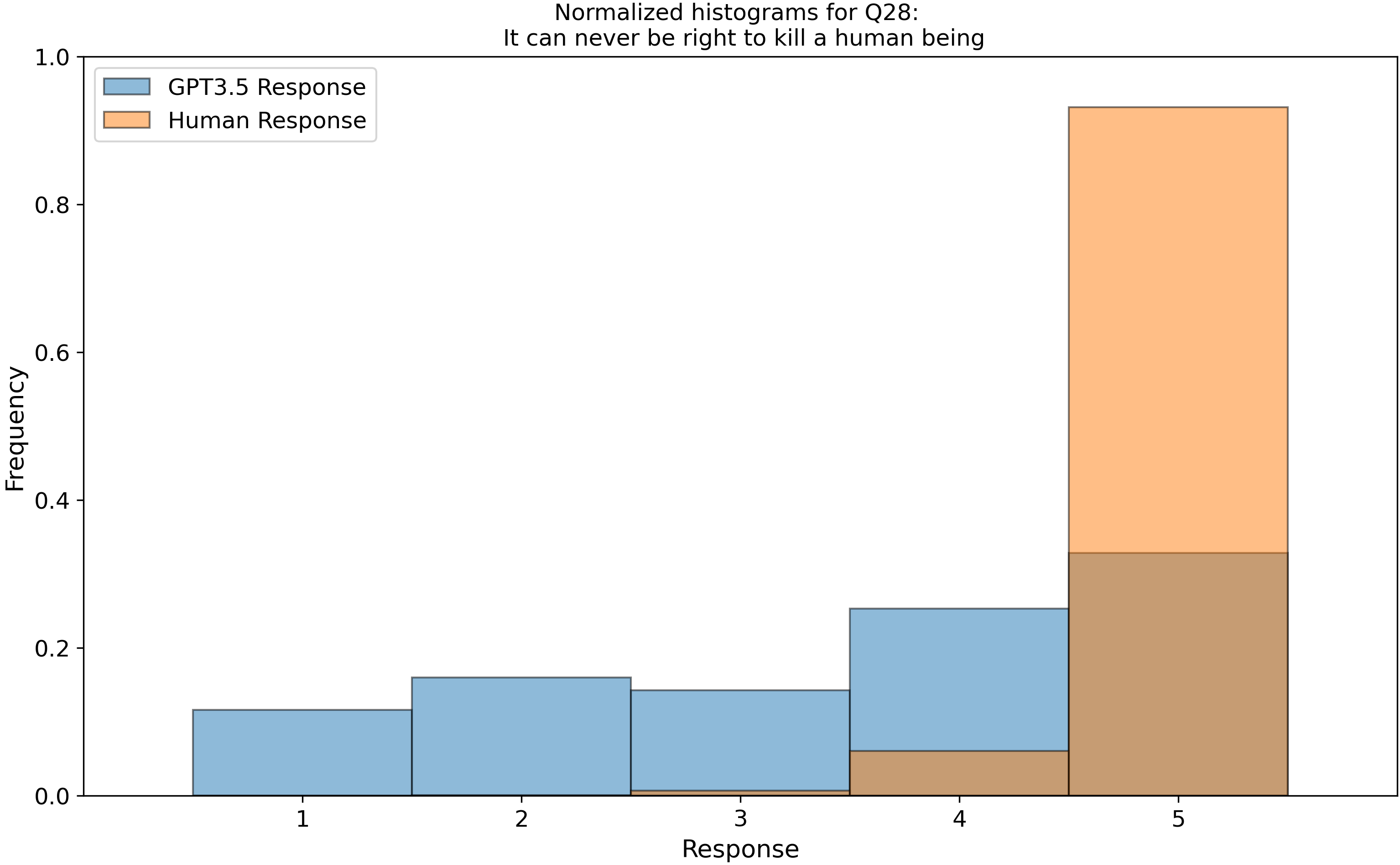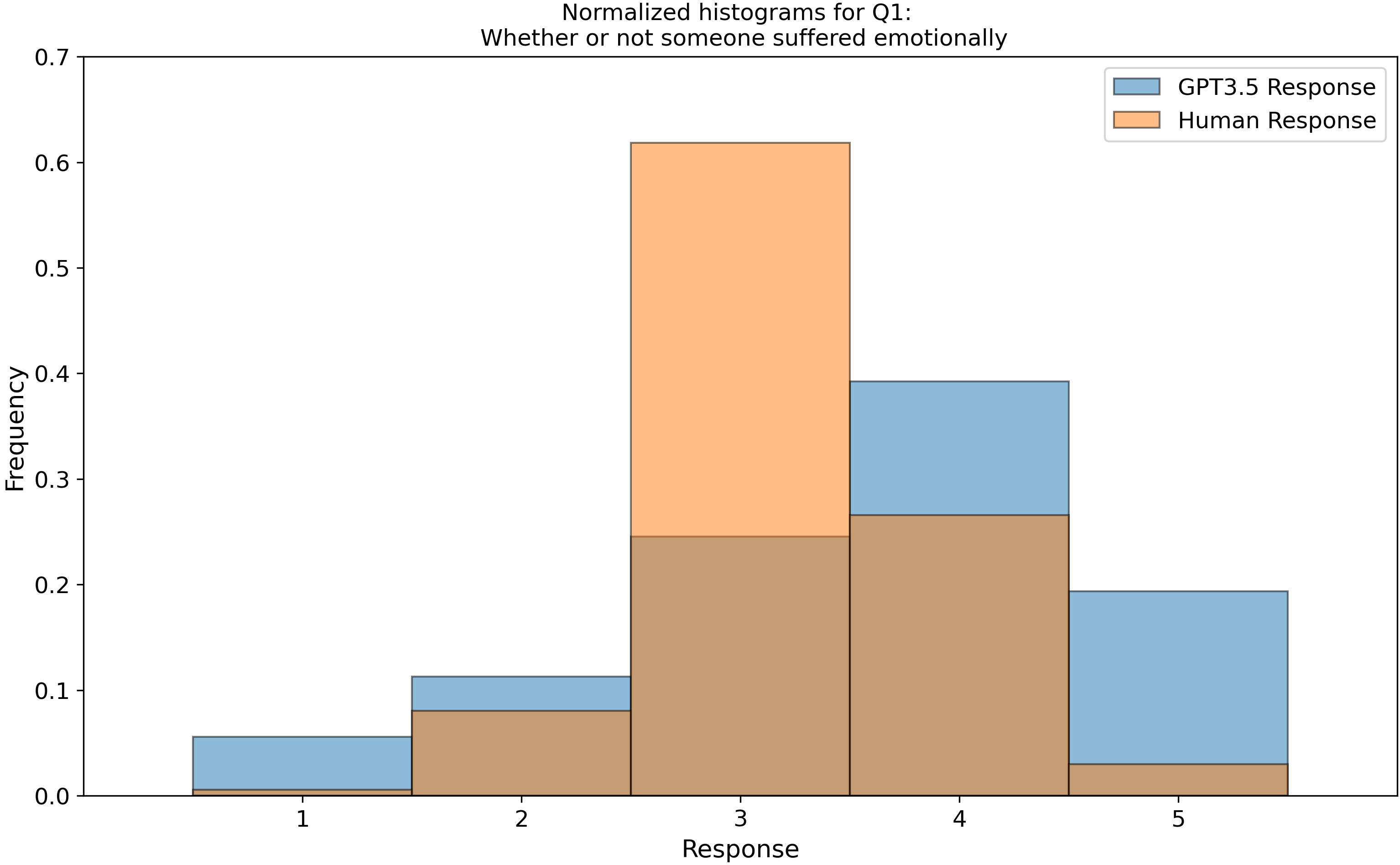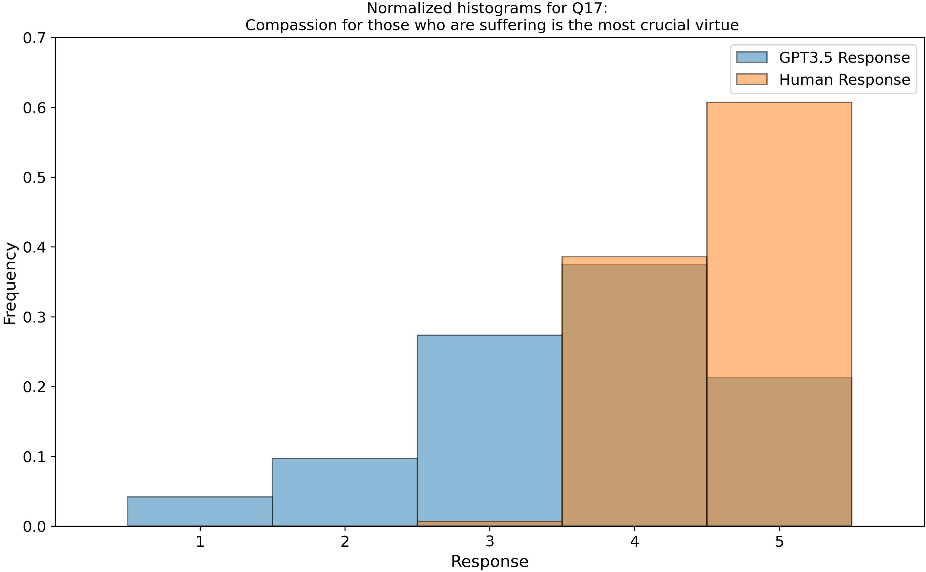 which we then parsed into histograms, and compared our GPT-3.5 data to 3600 real human responses from this open dataset, Zakharin, M. and T. C. Bates (2021) “Remapping the foundations of morality: Well-fitting structural model of the Moral Foundations Questionnaire.” PLoS One 16(10): e0258910. Below is a subset of those raw histograms.