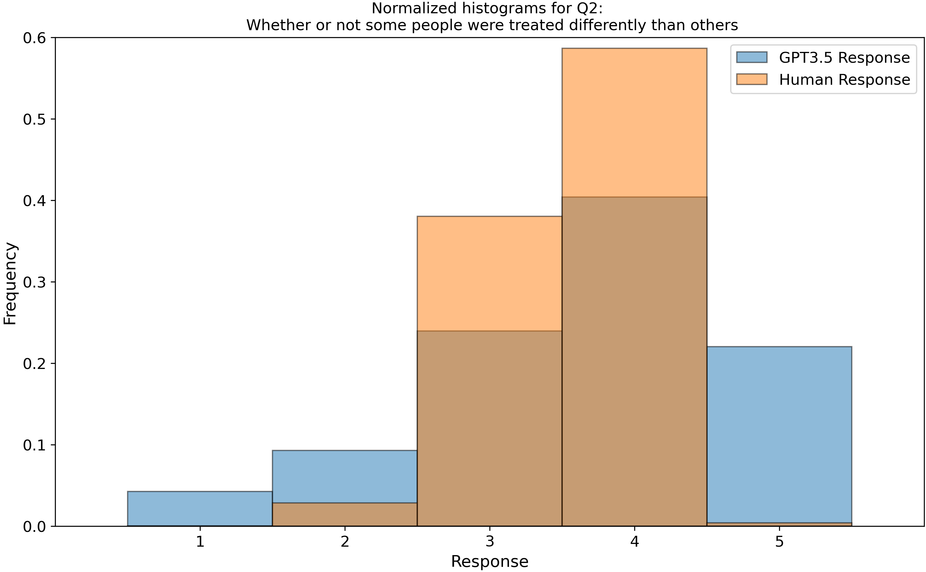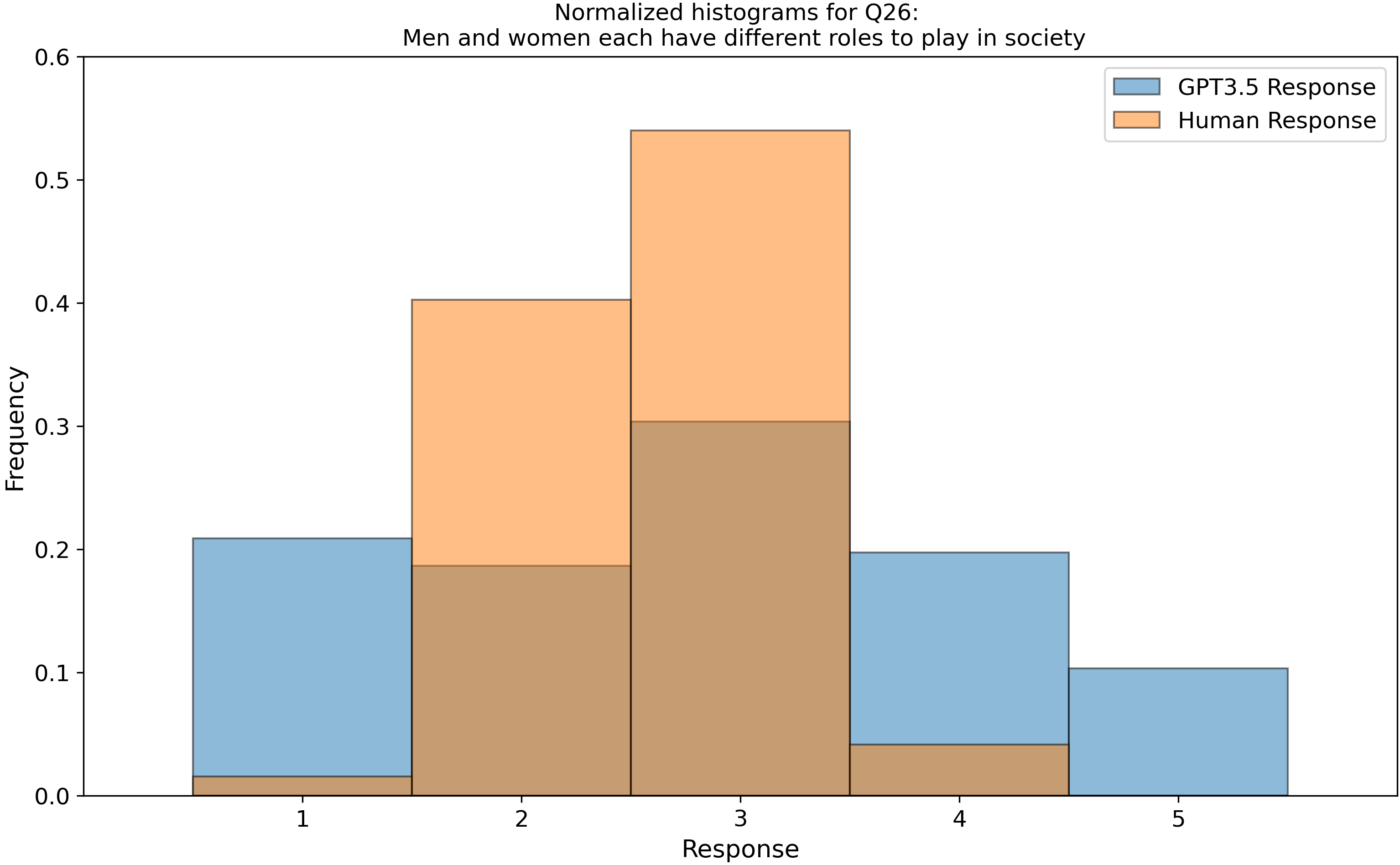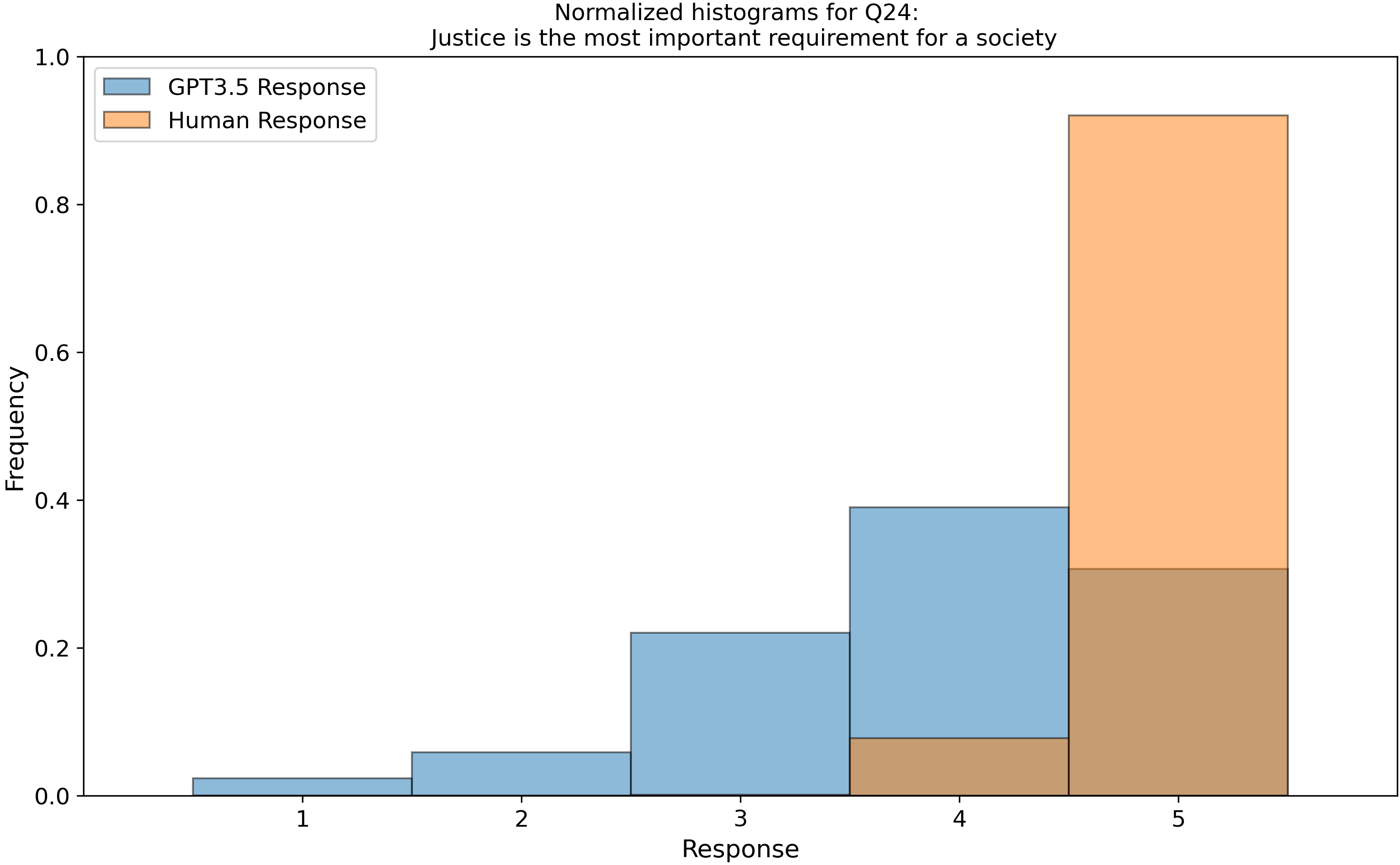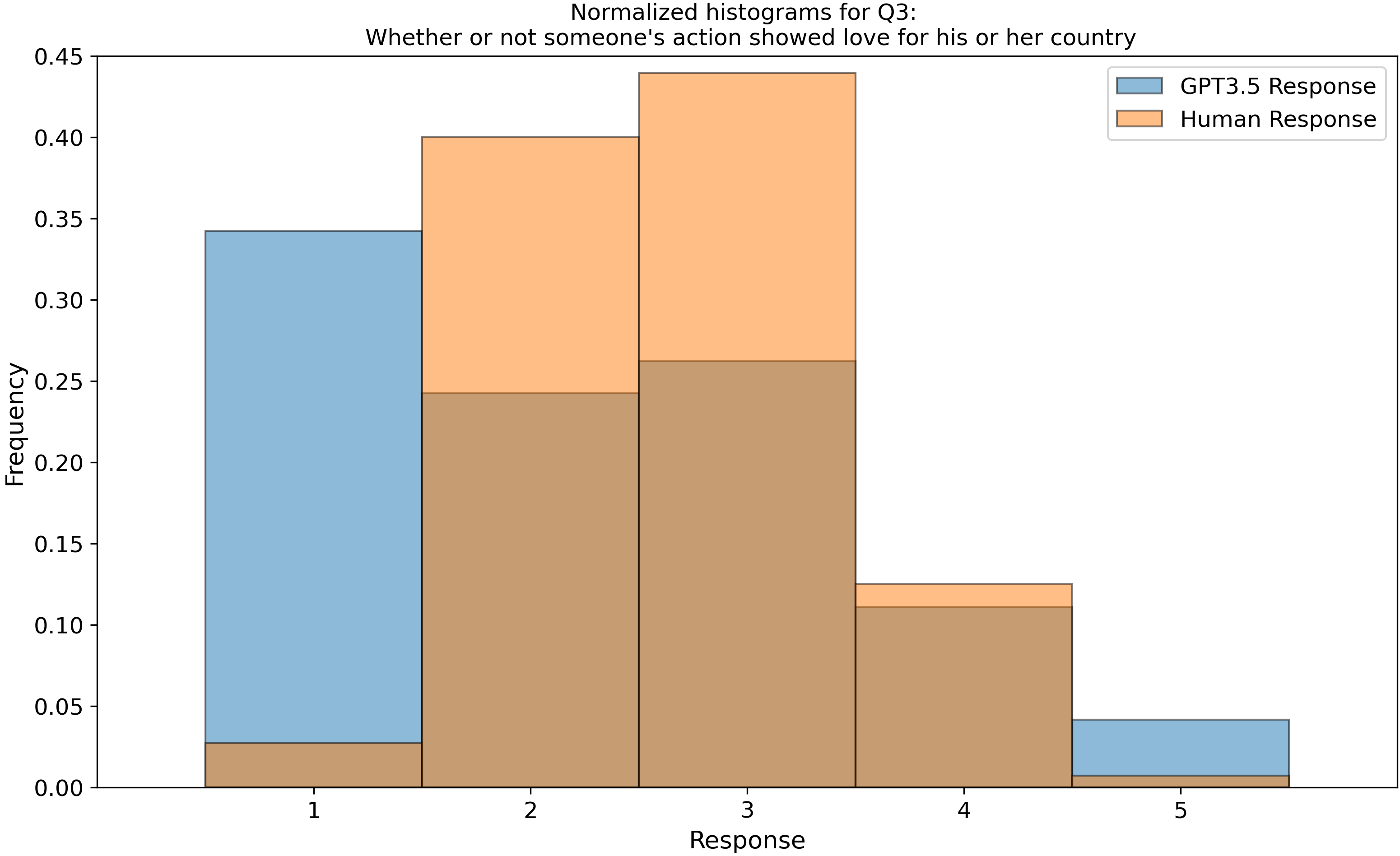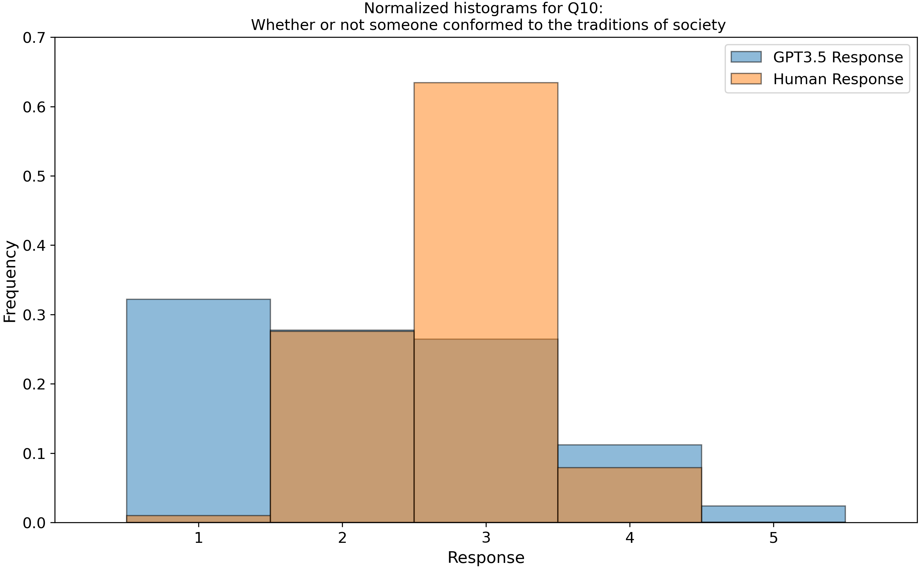 All of the questions are all answered with a single number between 1–5. Given my naive understanding of LLMs at the time, I would expect, a priori, that the model I am querying (since it can only give a single digit response) should respond 1–5 randomly for each question and that the resulting ditribution on any given question should be uniform between 1 and 5, because the LLM does not get to “parrot” out a bunch of words which likely make sense put together, in the context of the question. I would also not expect GPT to match the human distributions at all.